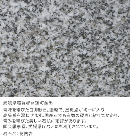 石英・長石・雲母などの結晶が小さく、その結晶が緻密なために、他の花崗岩と比べると職人泣かせといわれるほど硬く、その硬さは水晶と同等の硬度です。